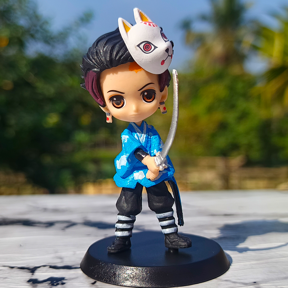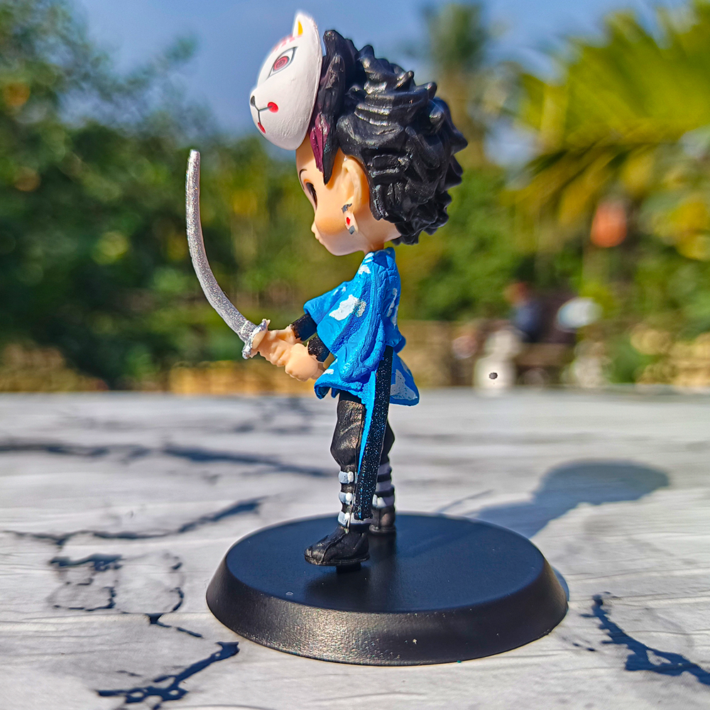 Standing approximately 7 cm tall, this compact figure showcases Tanjiro wearing the traditional Final Selection attire, complete with the signature fox mask worn during his training under Sakonji Urokodaki. Despite its small size, the figure offers impressive detailing—from the mask design to the outfit sculpt—making it perfect for desks, shelves, car dashboards, or mini anime displays. A sturdy round base ensures stable placement.